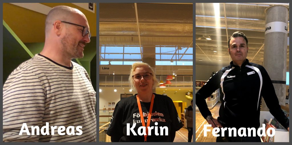 Vi har varit i Rosengårds biblioteket som är i Rosengårds centrum, Dicksons väg 6. Vi har först intervjuat 3 personer. Qaisar har intervjuat Karin, Andreas och Fernando.